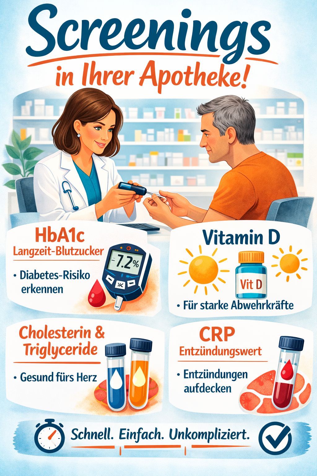 von Vitamin- D, Cholesterin und Triglyceriden, HbA1c (Langzeitblutzucker)
